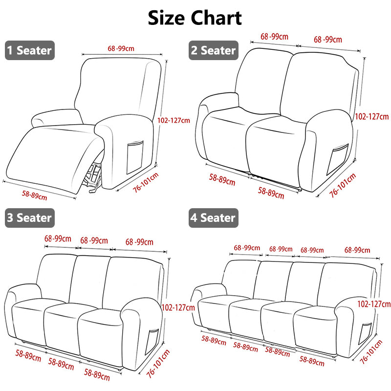 No matter whether it is a 1-seater, 2-seater, 3-seater, or 4-seater, please measure the seat length, seat width, chair back width, and chair back height of a single-seat, as long as the measured values are within the range of the size table, it means The recliner cover fits.