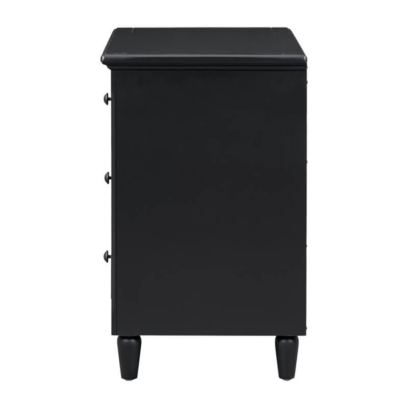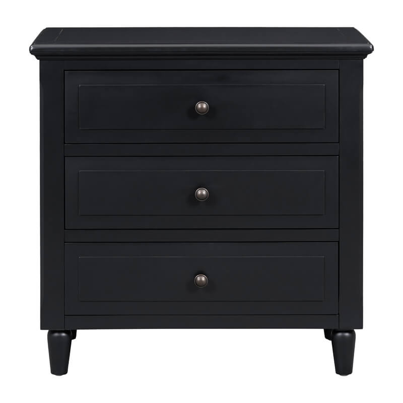 With three spacious drawers, this nightstand offers plenty of room to store all your essentials. The vintage solid-color finish with antique brass hardware creates a warm and sophisticated feel. The drawers feature full-extension drawer glides for easy opening and closing, making them the perfect addition to any bedroom. Raised cabinet feet are attractive and easy to clean, providing you with a tidy space.