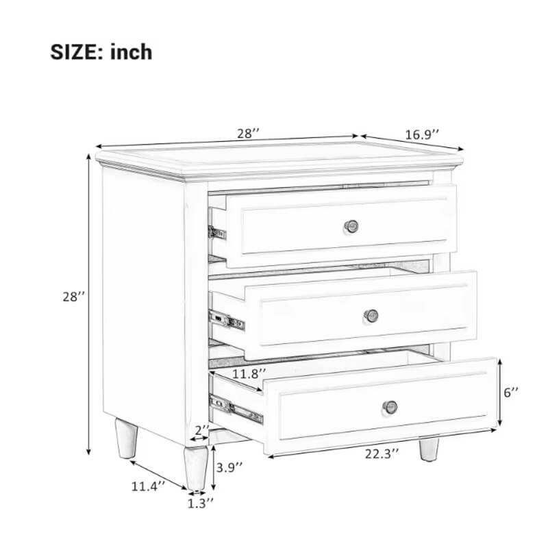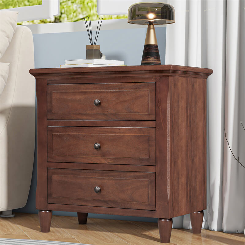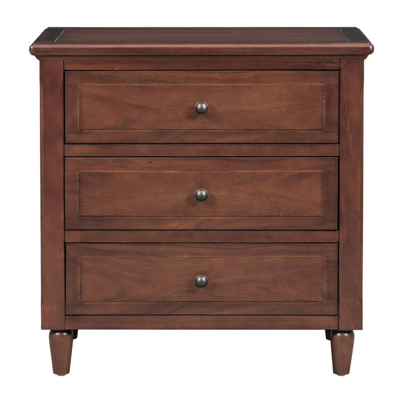 With three spacious drawers, this nightstand offers plenty of room to store all your essentials. The vintage solid-color finish with antique brass hardware creates a warm and sophisticated feel. The drawers feature full-extension drawer glides for easy opening and closing, making them the perfect addition to any bedroom. Raised cabinet feet are attractive and easy to clean, providing you with a tidy space.