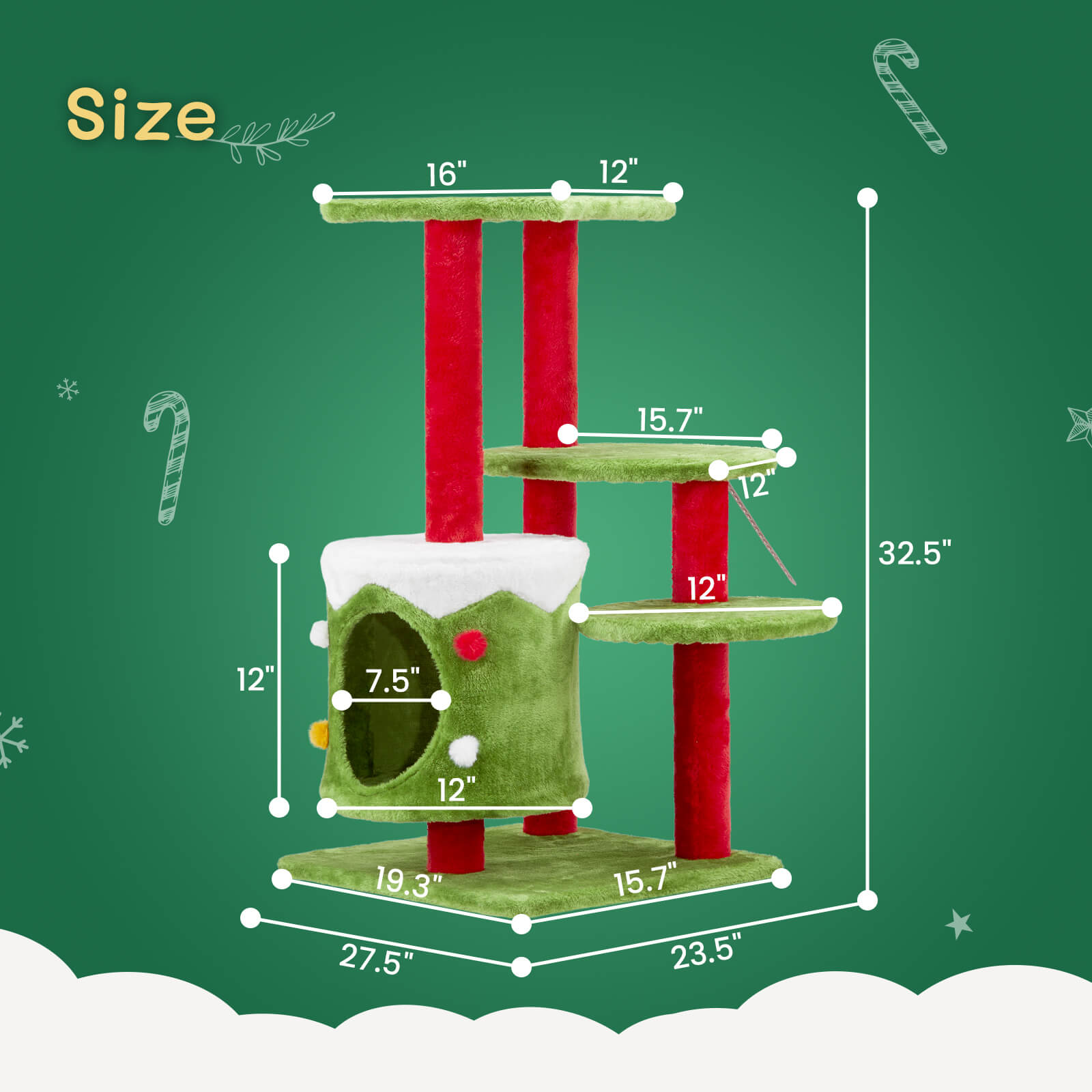 Add a touch of holiday cheer to your home while keeping your cat entertained with this festive 32in Christmas-themed cat tower. This 3-level activity center is designed to provide endless fun and comfort for your feline friend, featuring multiple platforms for jumping and lounging, along with a cozy condo for rest. Made with sturdy materials and designed for stability, this cat tree offers the perfect combination of play, relaxation, and festive decor for your home.