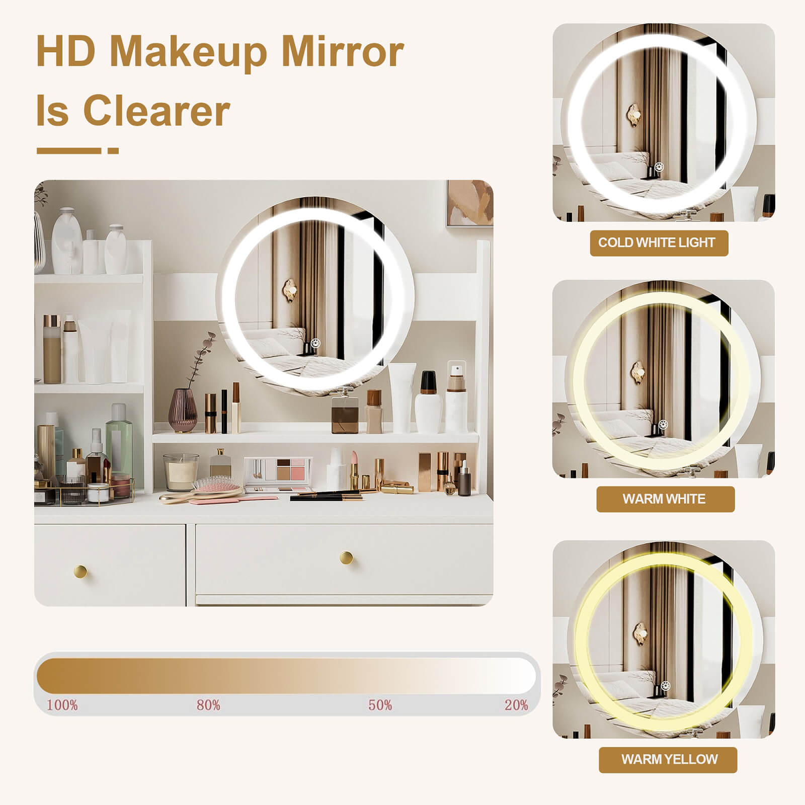 Enhance your daily beauty routine with a modern white dressing table set. The core of the set is a large LED-lit mirror that provides a wide viewing angle for your precise makeup application.