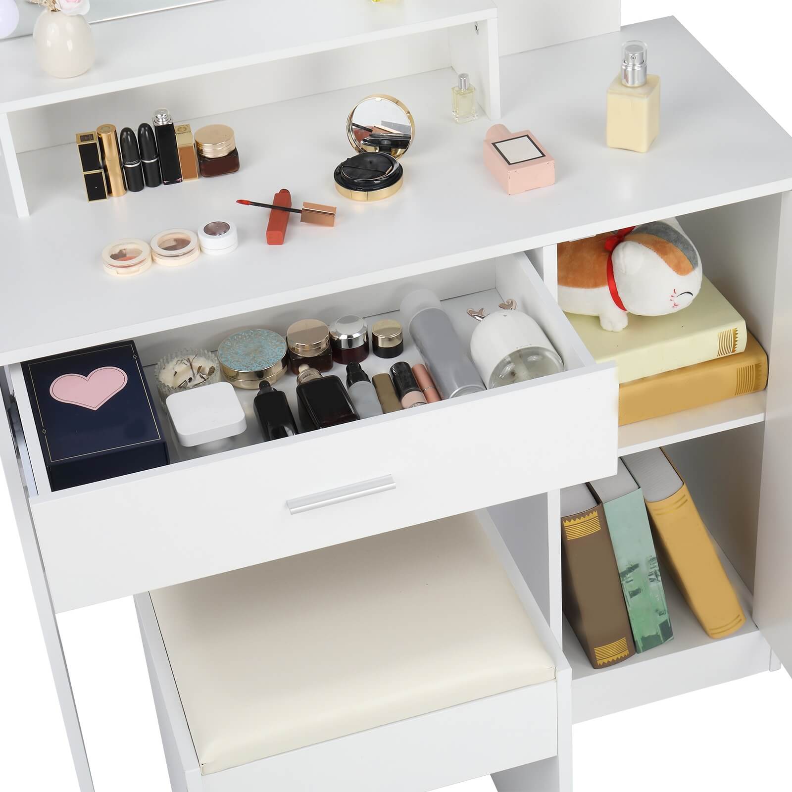 Ample storage capacity: With 3 built-in shelves, a large drawer, and a cabinet, staying organized has always been challenging. The open shelves on the tabletop are also a great place to display photo frames, jewelry, flowers, and more. Tiered storage in the cabinet makes items easy to find.