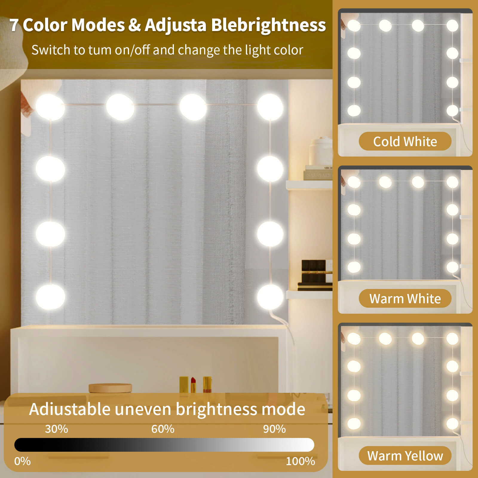 3 lighting modes with adjustable brightness: The mirror contains 10 LED bulbs, offering 3 color lighting modes (warm, natural, cool) and adjustable brightness, ensuring perfect lighting at any time of day or when applying makeup.