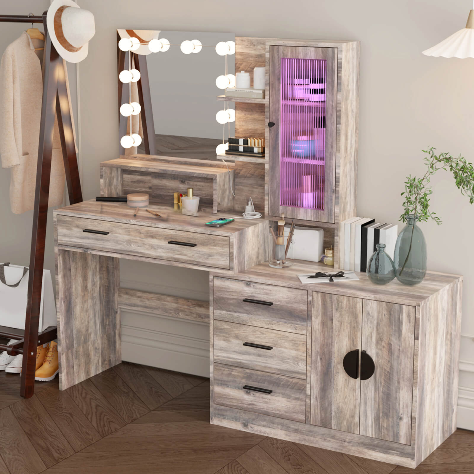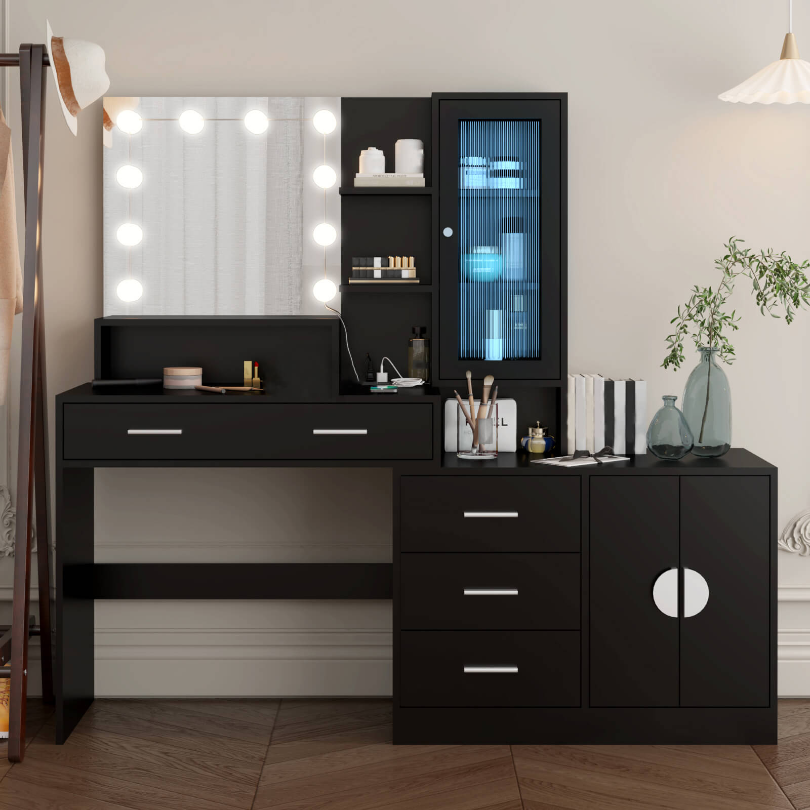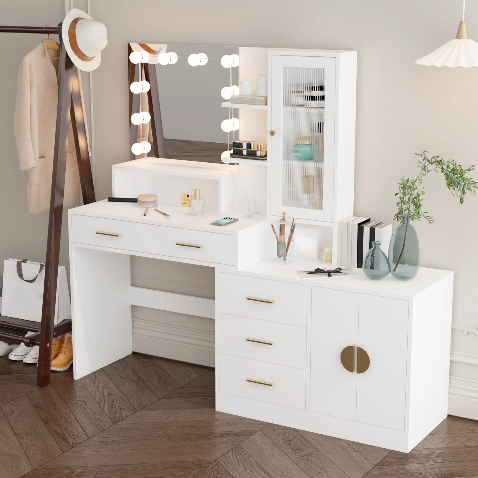 2-in-1 vanity and dressing table combo: Combining the best of both a makeup table and a dressing table, this versatile vanity offers 1 large drawer, 3 small drawers, 5 tabletop shelves, 2 cabinets, and 2 staggered tabletops, giving you plenty of storage space
