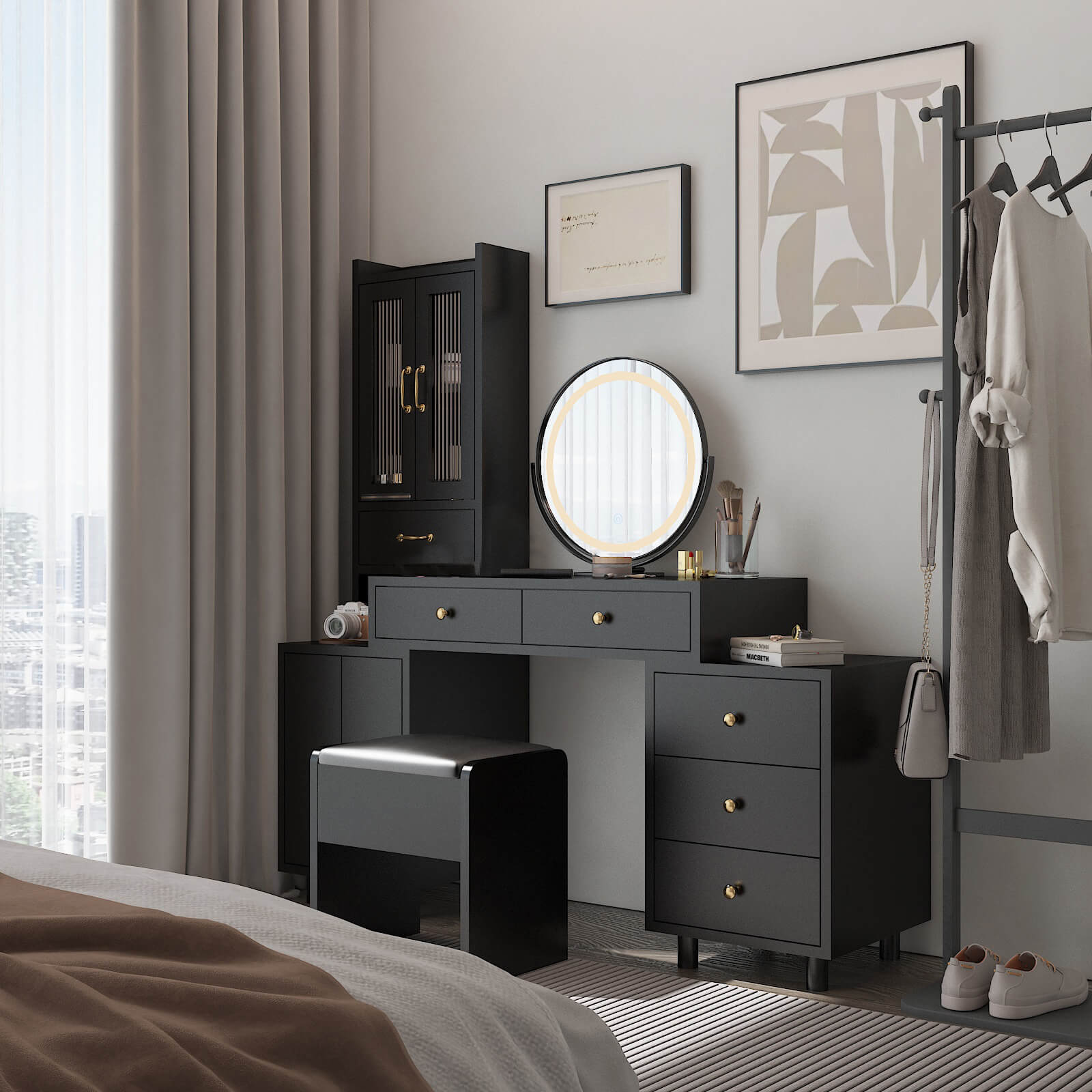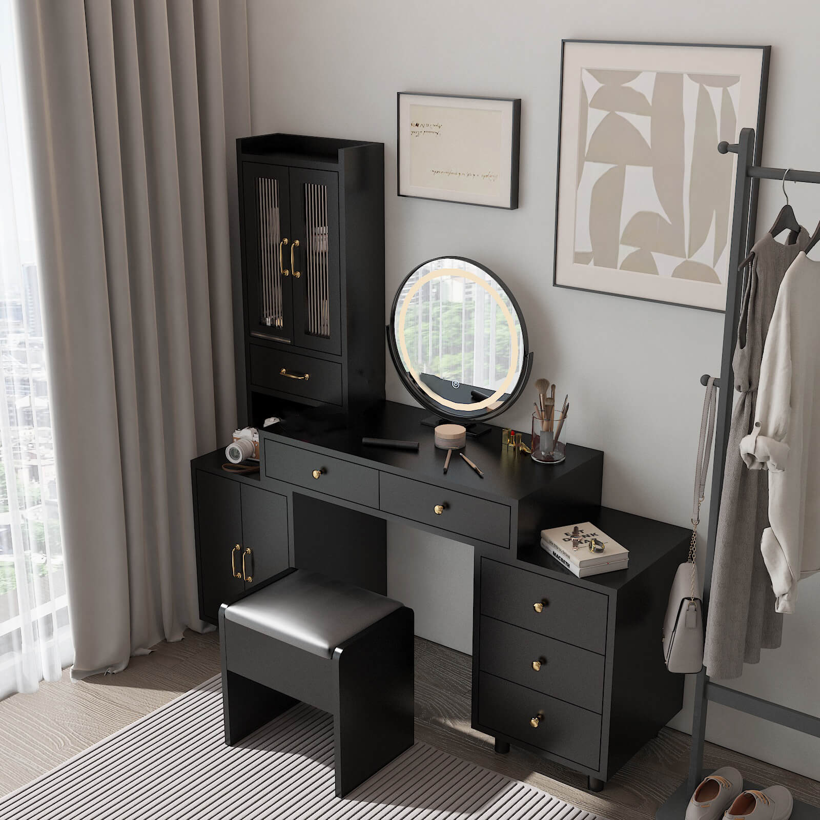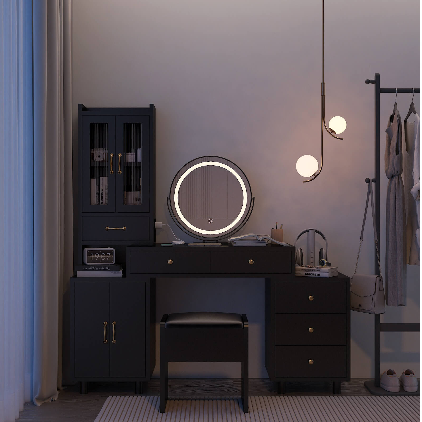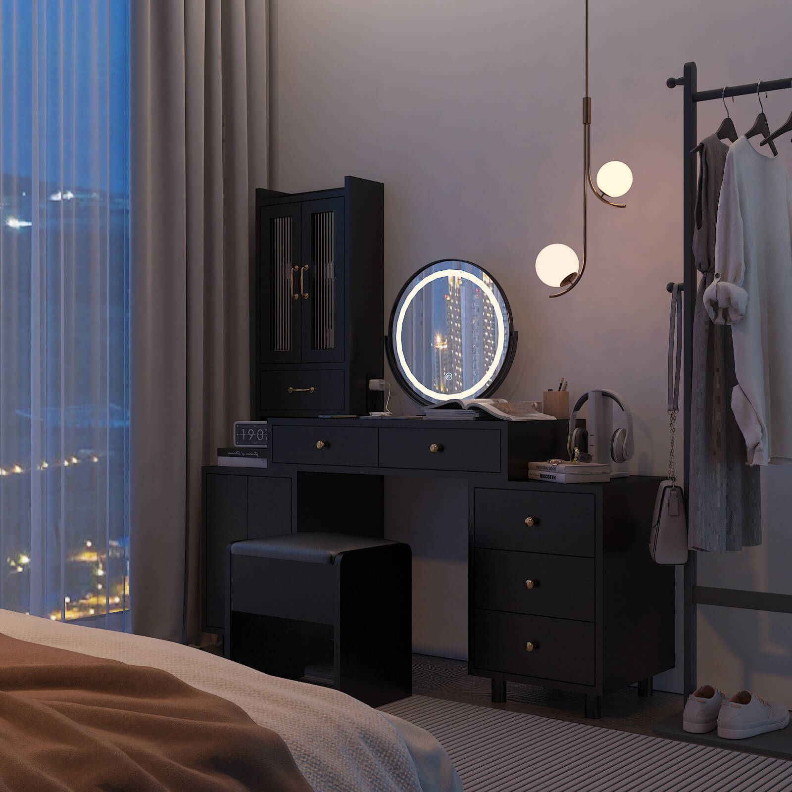 This vanity unit combines a versatile storage cabinet, a retractable dressing table, and a convenient nightstand in a 3-in-1 set, providing an all-inclusive solution for your beauty needs. The vanity unit offers ample surface area and cleverly designed drawers with zoned storage. You can position the side cabinets and nightstand on either side of the vanity unit to create a custom layout that fits your space perfectly. The adjustable LED mirror features three light colors and brightness levels to ensure optimal lighting for all your beauty rituals.