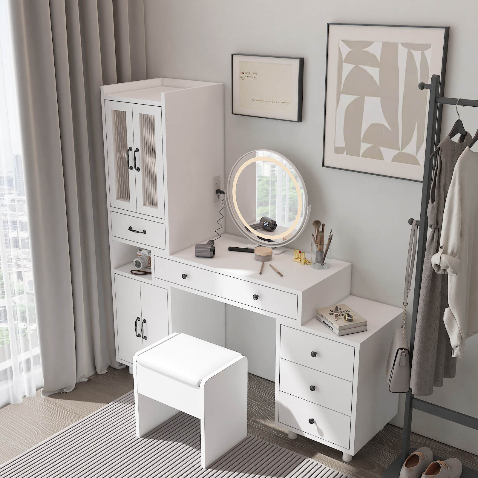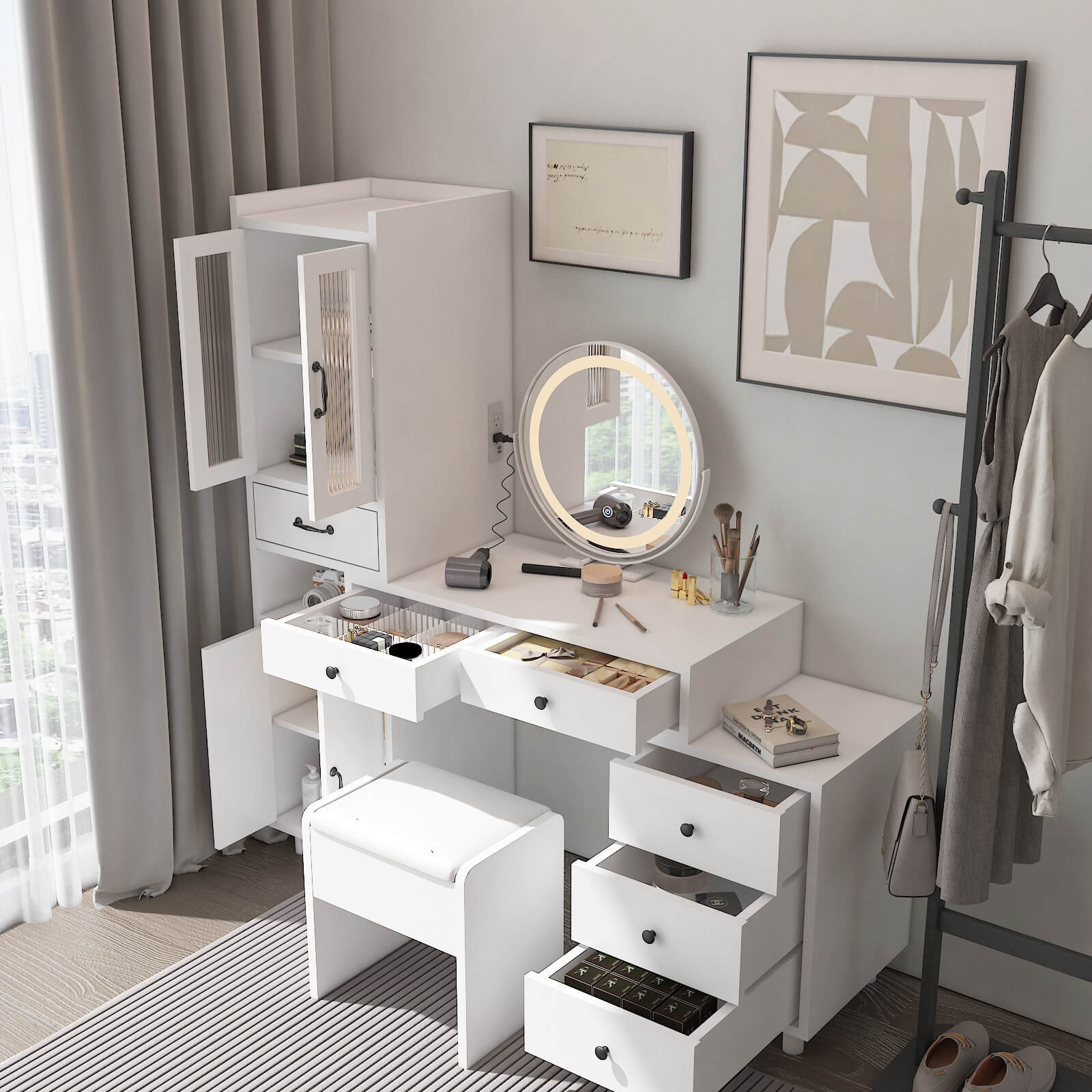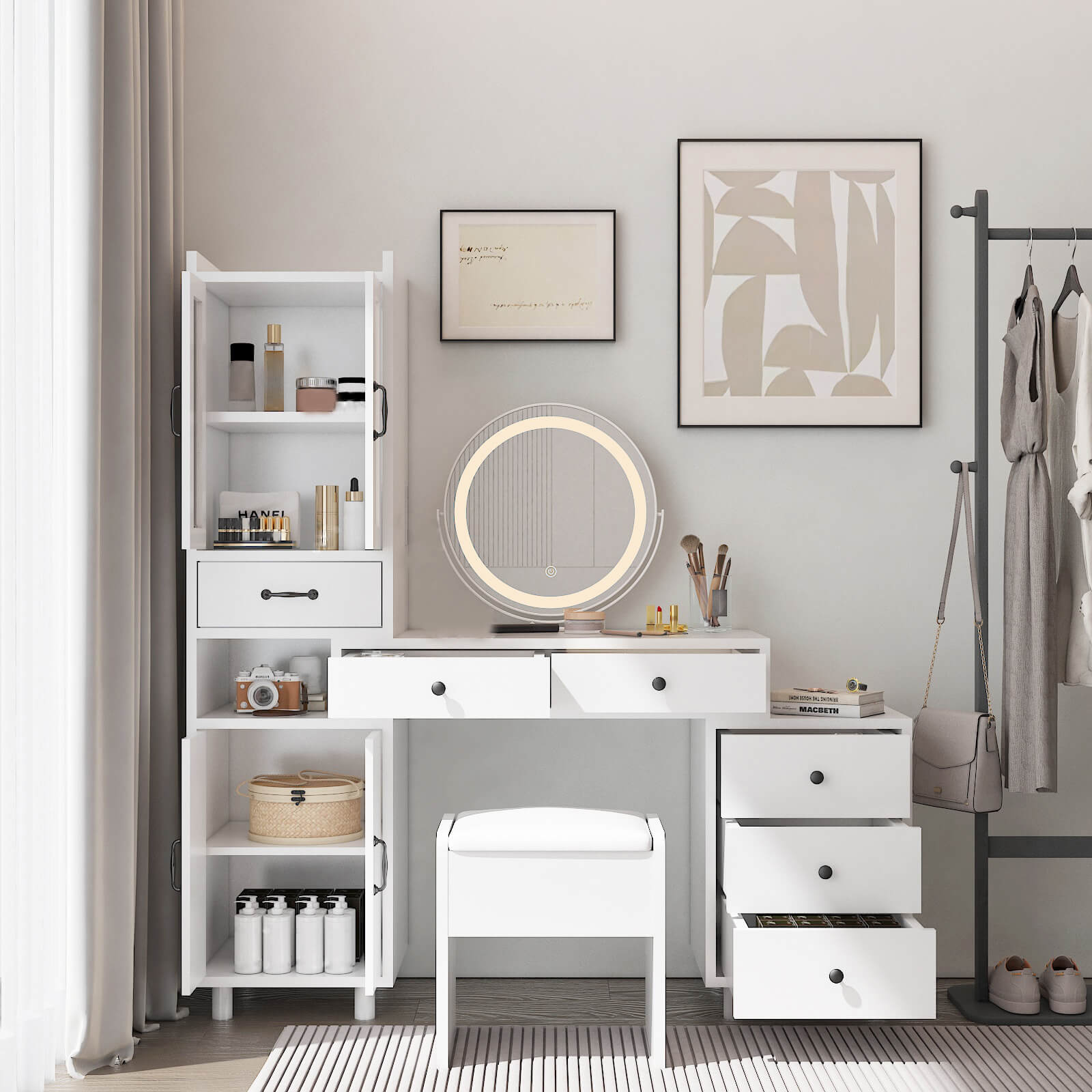 Retractable Design and Customizable Layout: The vanity can be extended or retracted to fit your space and needs. Side cabinets and nightstands can be placed on either side of the vanity, allowing you to create a layout that best suits your space and personal preferences.