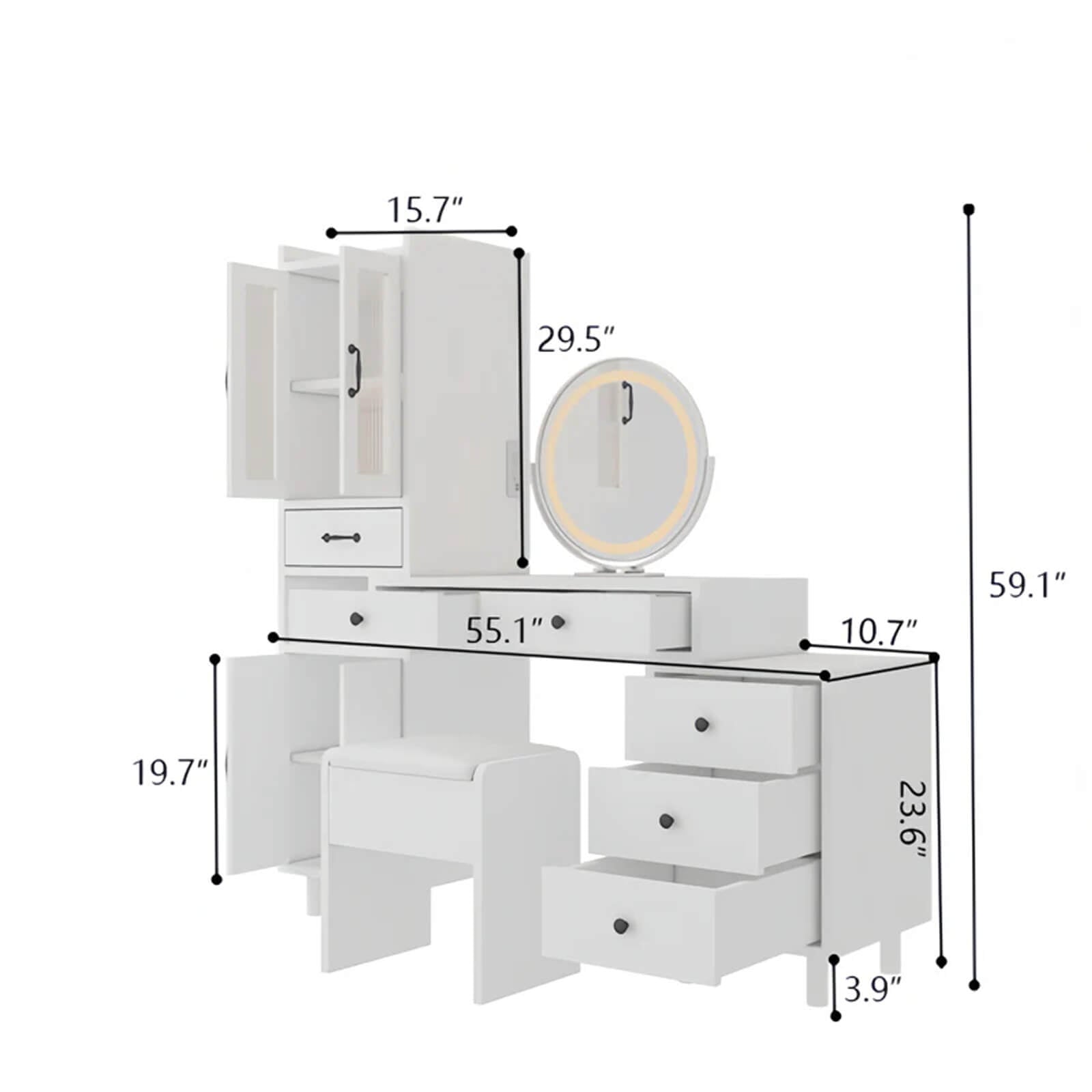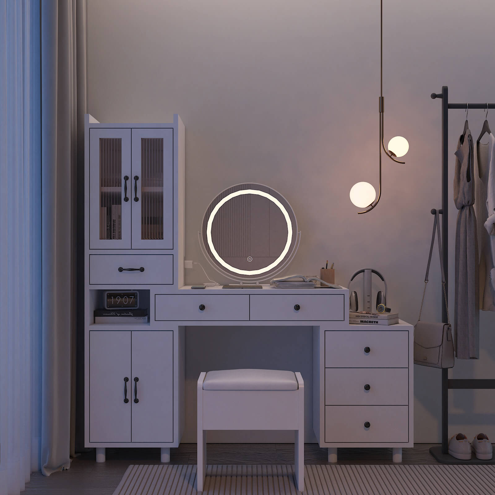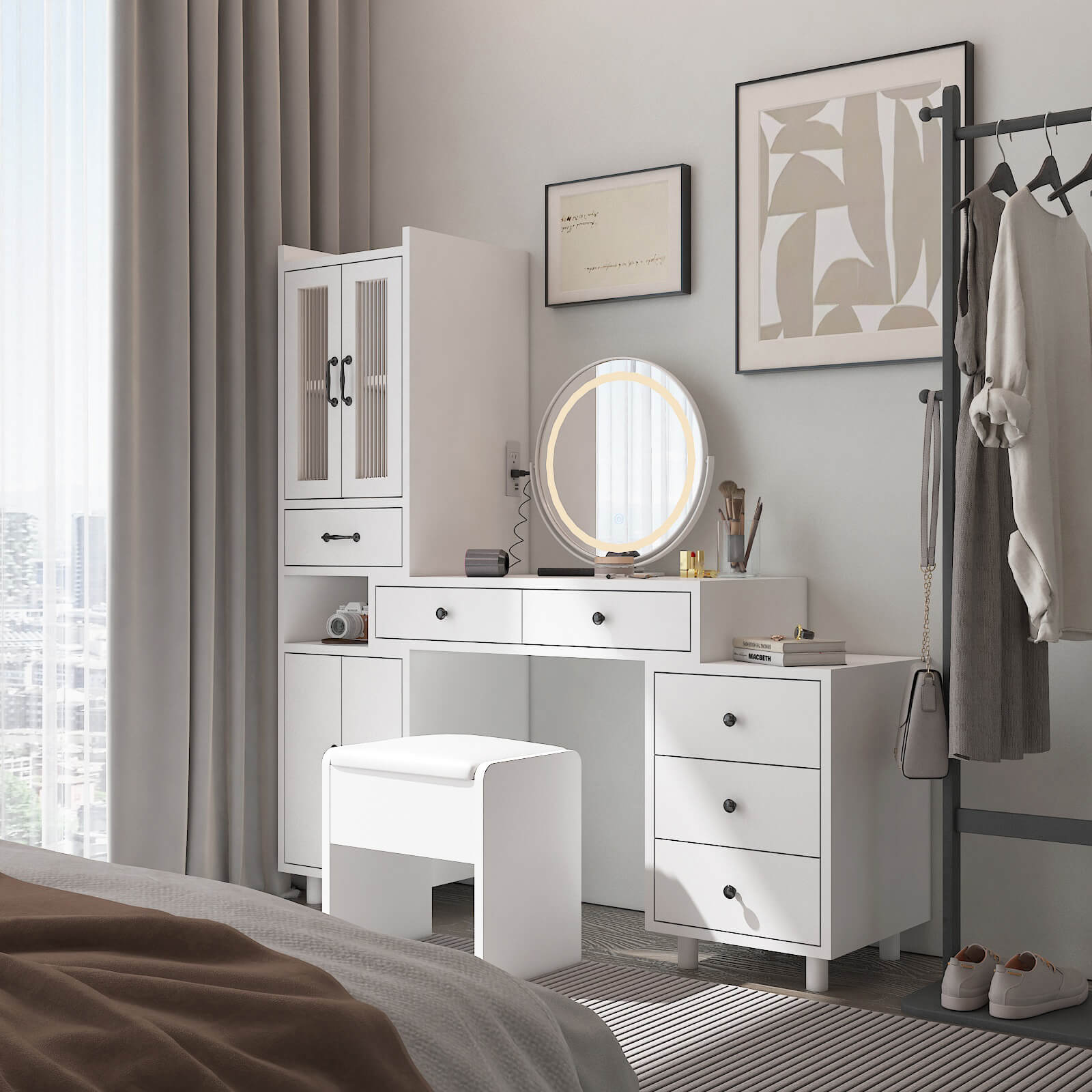 Retractable Design and Customizable Layout: The vanity can be extended or retracted to fit your space and needs. Side cabinets and nightstands can be placed on either side of the vanity, allowing you to create a layout that best suits your space and personal preferences.