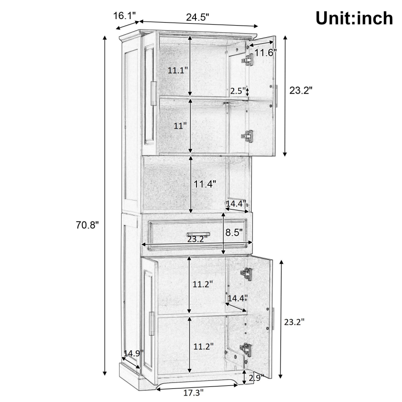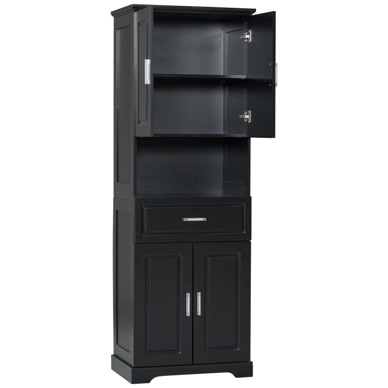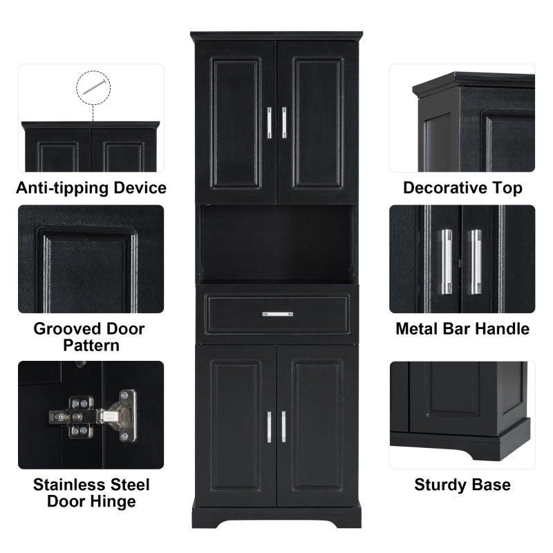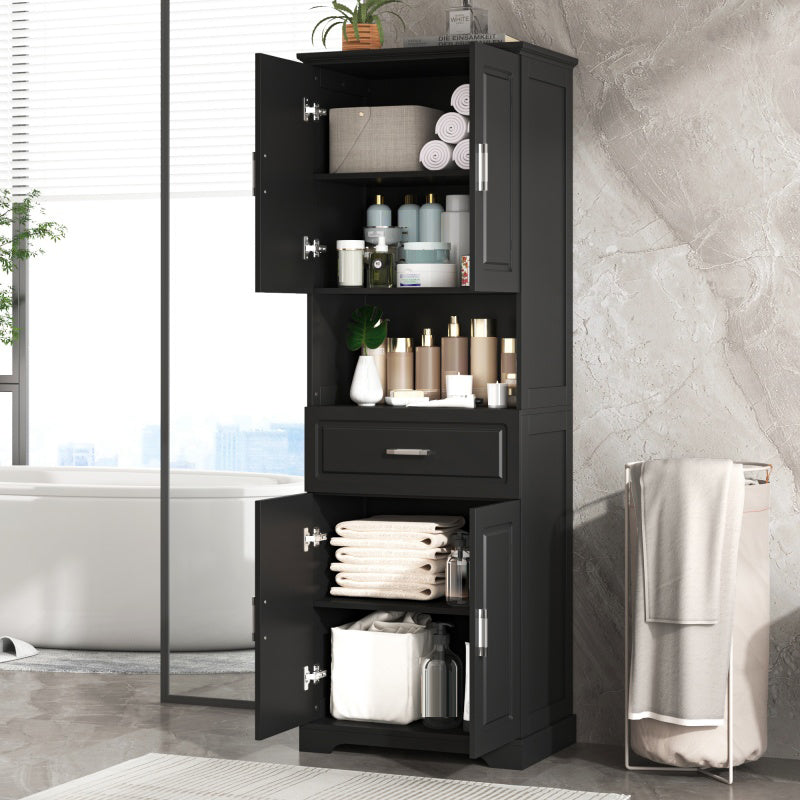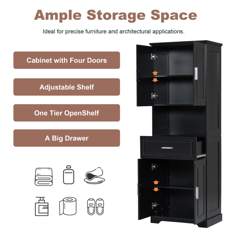 Versatile storage: The bathroom's tall cabinet is equipped with four doors and a drawer, providing a variety of storage options. You can organize and store towels, toiletries, kitchen utensils, etc., making your living space neat and orderly.