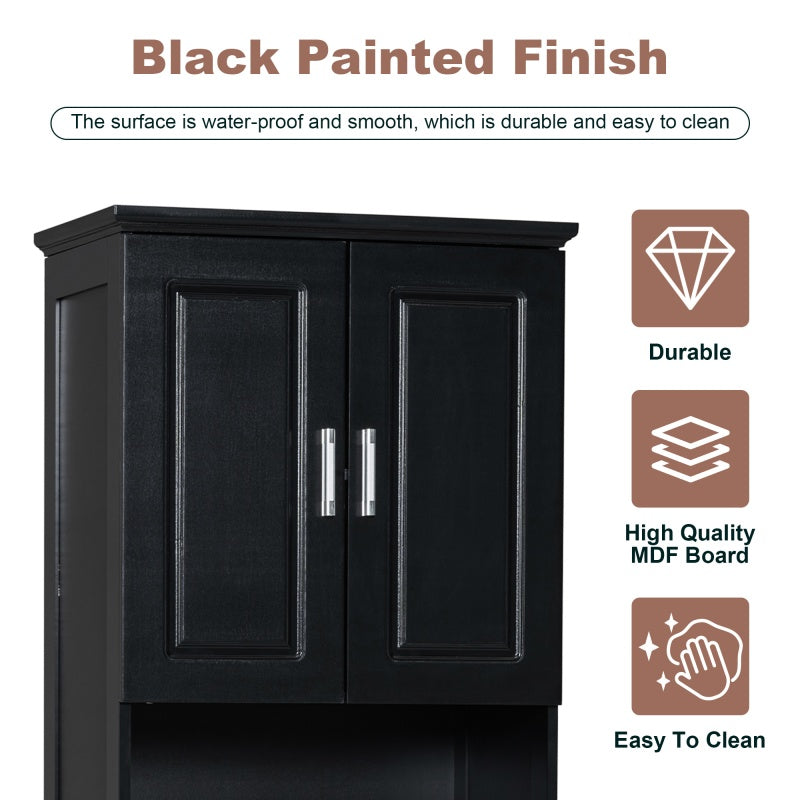 This modern black tall bathroom storage cabinet features a simple black style cabinet door panel and silver round knobs, which can easily match your various decoration preferences and is excellent bathroom furniture.