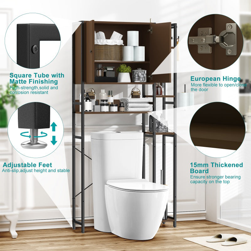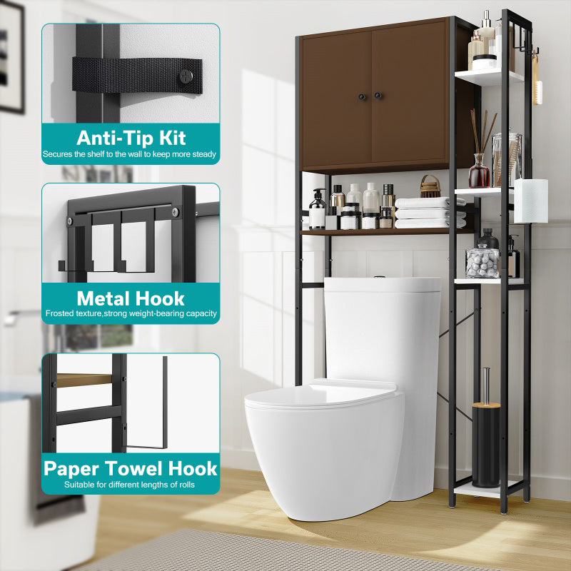 Ample Storage Space: Our above toilet storage cabinet comes with a double-door cabinet and five open shelves, providing ample storage space for your bathroom. Convenient access to daily necessities such as soap and towels. Keep your bathroom neat and organized.