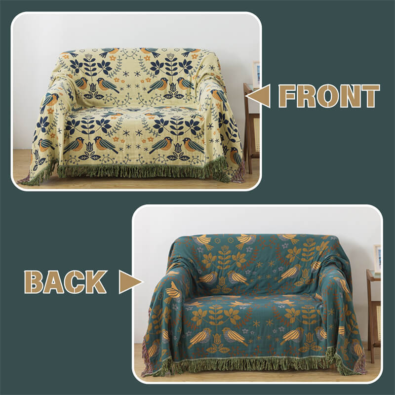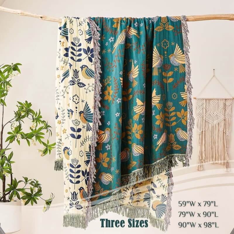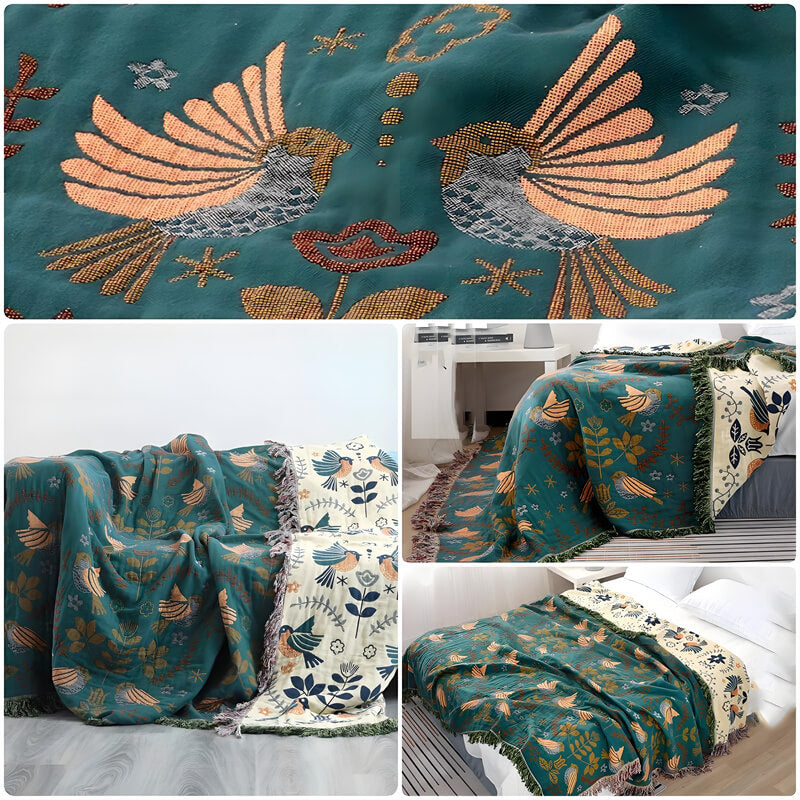 This reversible boho blanket features a unique bird and floral weave pattern with fringed edges. It is made of high-quality cotton and precision braided to ensure every touch feels doubly soft. It is ideal for draping on cool evenings or adding an artistic touch to your home decor.