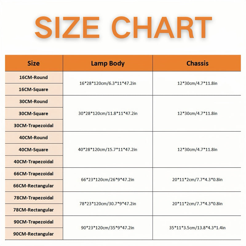 Lights are available in a variety of sizes with two pole lengths; 16/30/40cm Light: 20cm/7.9in pole x 4; 8cm/3.2in pole x 1; Directional head 180+360° x 1. 66/78/90cm Light: 20cm/7.9-inch boom x 8; 8cm/3.2-inch boom x 3; 3.2-inch boom x 2; directional head 180+360°x 2.