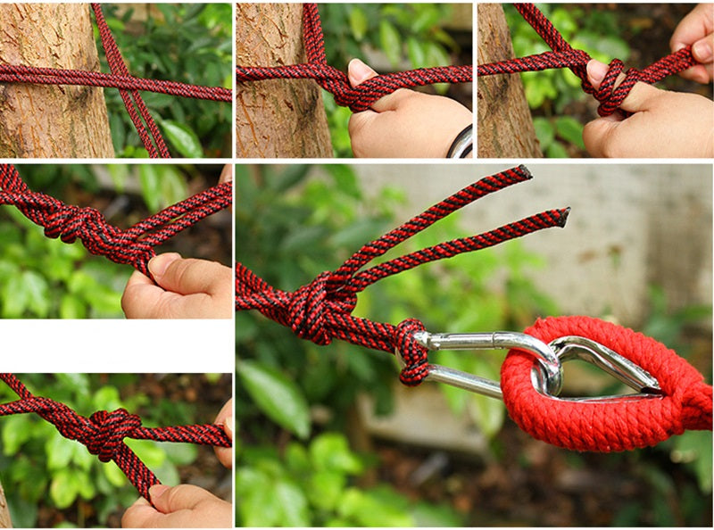 - The hammock tends to sag when use, please adjust its height by the ropes and do not overly tighten the hammock. It is recommended that the lowest point of the hammock should keep 20-40 cm above the ground.