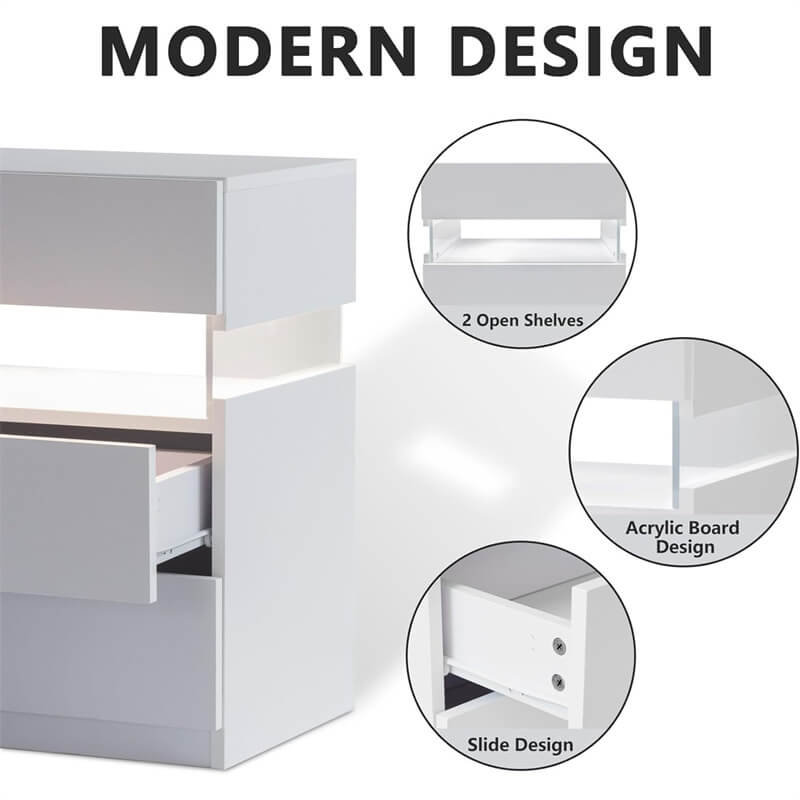 The 2 drawers of the LED dresser offer large storage space for nighttime necessities. The wood top is ideal for placing alarm clocks, phones, chargers, and eyeglasses, keeping them within your reach.
