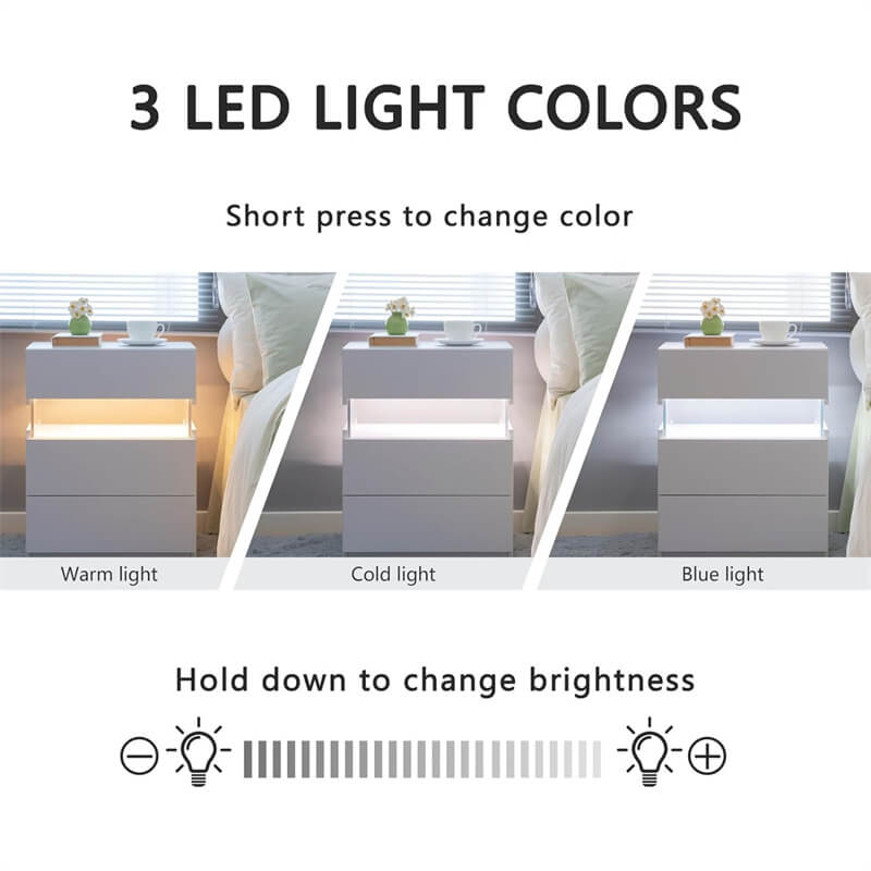 Featuring 2 drawers, this nightstand provides ample storage space for your personal belongings and keeps your room neat and organized. It also comes with three adjustable LED light sources, so there's no need to purchase a separate night light. It is made of high-quality MDF and solid wood for stability and durability to ensure long-lasting use. With this LED nightstand, you will have a beautiful night!