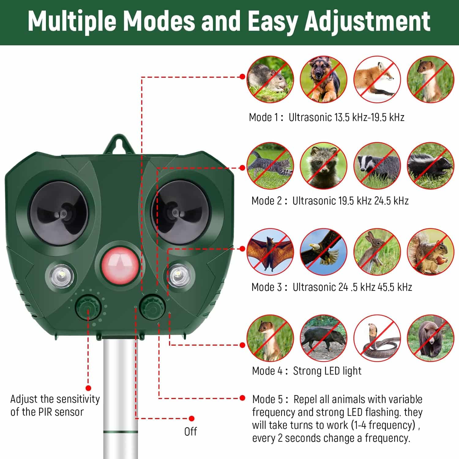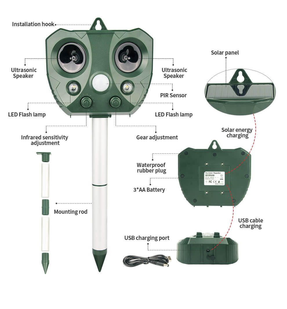 Adopts advanced ultrasonic and PIR motion-activated technology and is equipped with a powerful LED flash. It has 5 repellent modes, you can choose the appropriate mode according to different sensitivities and different animals, it can effectively repel animals and pests by emitting powerful ultrasonic waves and powerful LED flashes.