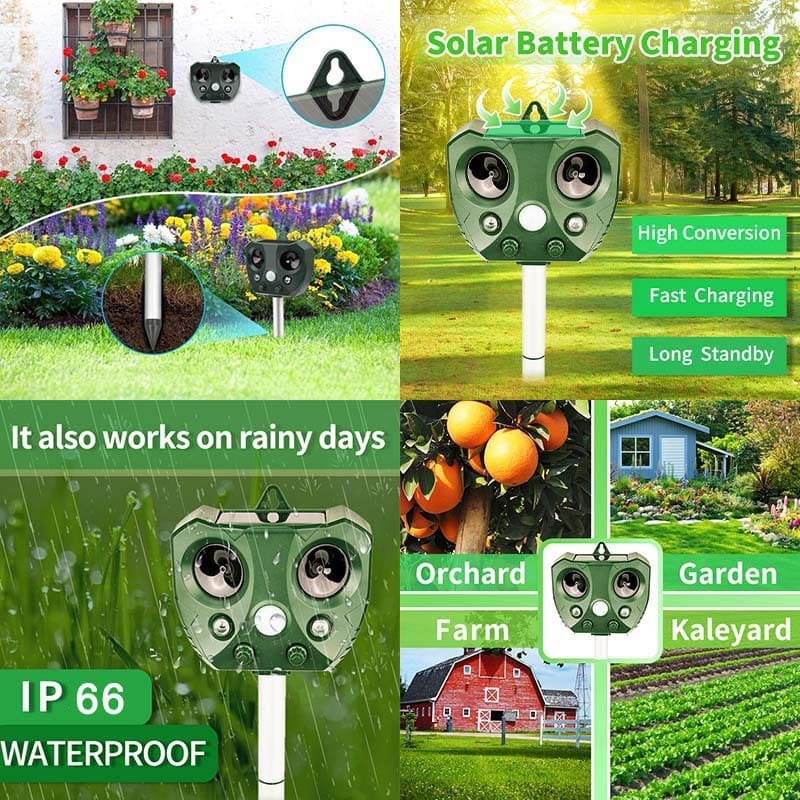 Then drive them away now! Use our ultrasonic insect repeller, when animals enter the area, it will emit ultrasonic waves, LED flash lights to drive away animals. Effectively protect your outdoor space! And will not hurt them