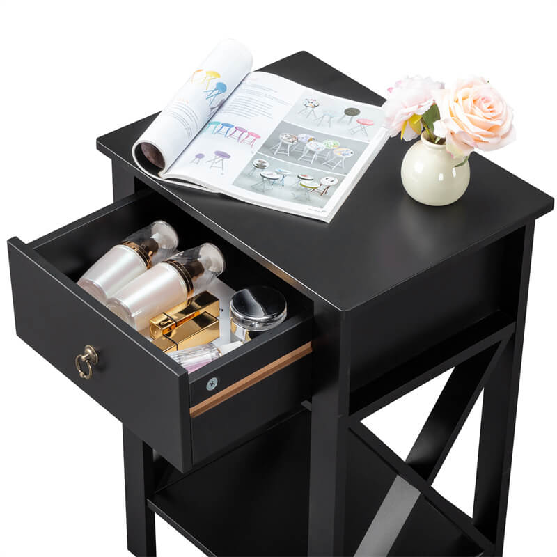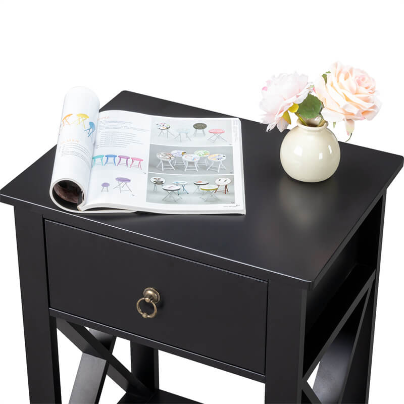Our bedside table features a simple yet stylish design that is practical and suitable for any room. Thanks to its compact size, it can be easily moved to any position in the room. The simple silhouette and X-shaped sides add elegant charm to your bedroom, living room, bathroom, or office, providing a space-saving storage solution.