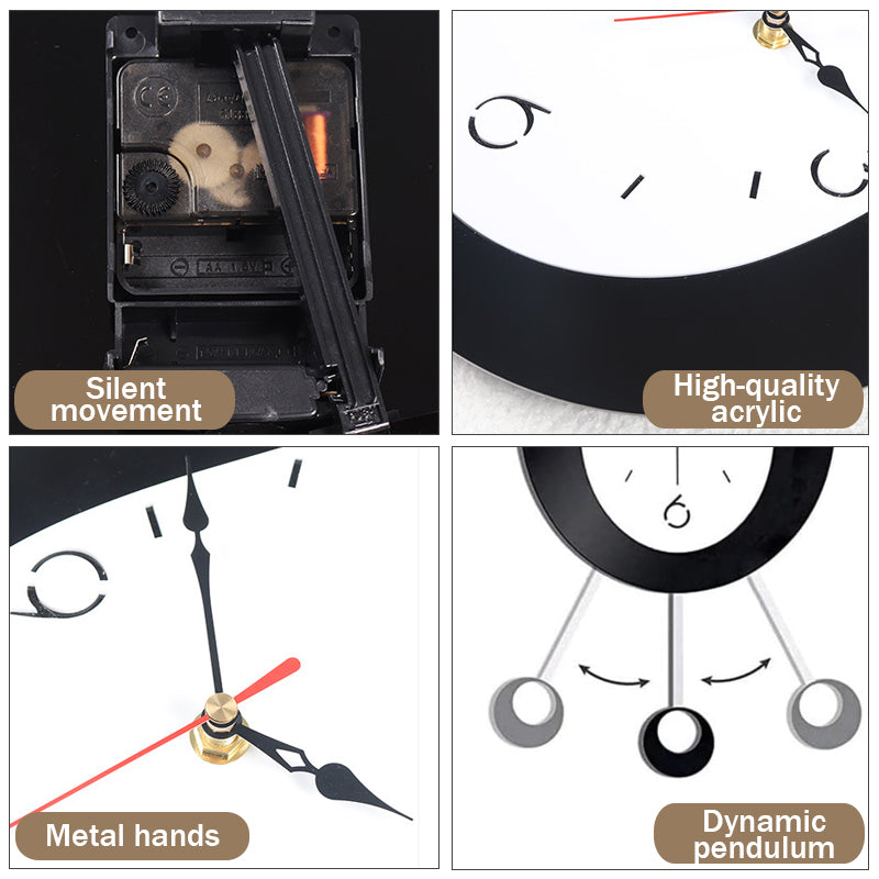 【Easy to Use】It only takes a few simple steps to install this kitchen wall clock. This modern wall clock is battery-powered and powered by 2 AA batteries (not included). One section is for the sweep second movement, the other section is for the pendulum.
